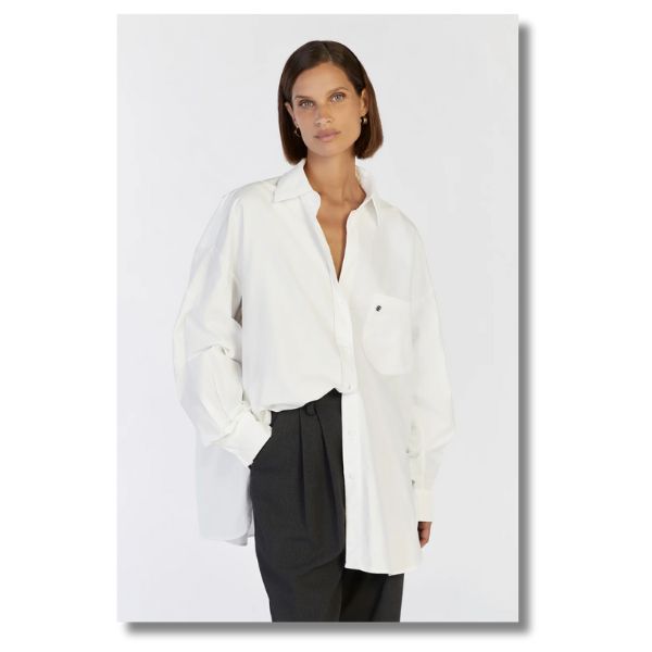 The Kantor Shirt by New Zealand womenswear label Harris Tapper. This shirt is the perfect addition to any outfit. It is made from crisp white cotton poplin and has a subtly masculine shape.