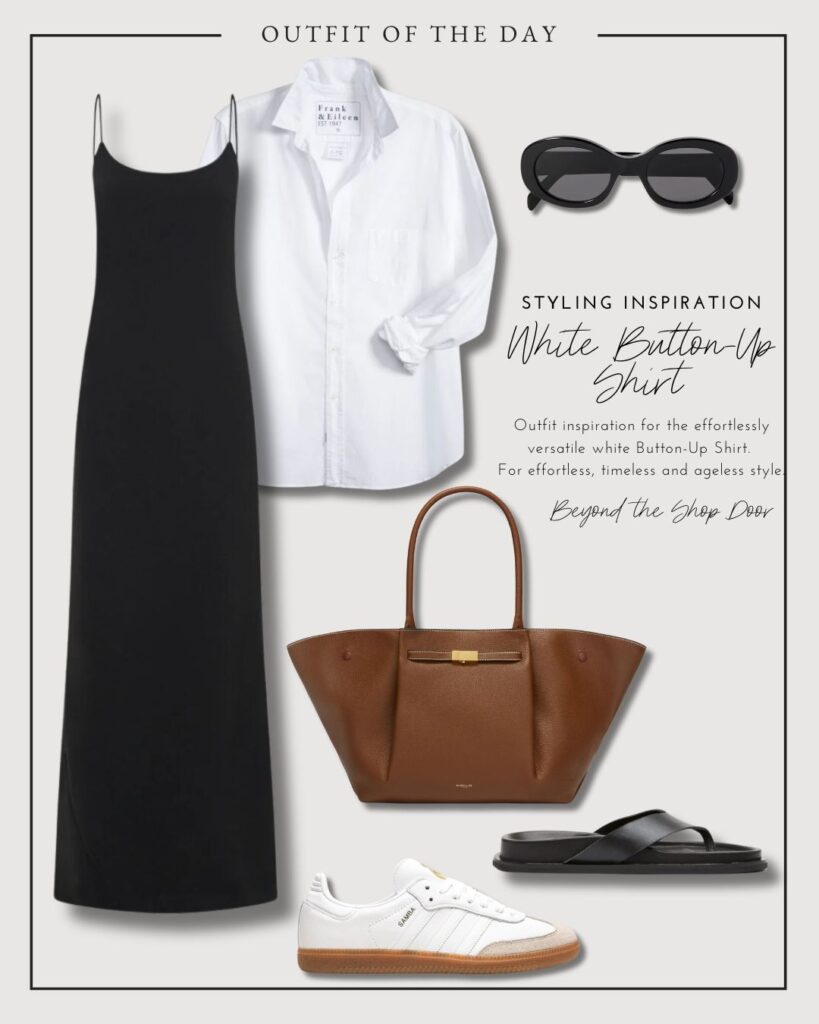 A white button-up shirt can still be used formally or equally to elevate something as simple as a pair of jeans or shorts. For those of us with a wardrobe full of sleeveless dresses or tops who are increasingly reluctant to bear our arms (it’s an aging thing I hear way too often). Then, the White Button-Up Shirt is a wardrobe hero and can be layered on top of sleeveless items, utilising existing wardrobe items with an effortless, timeless and ageless style.